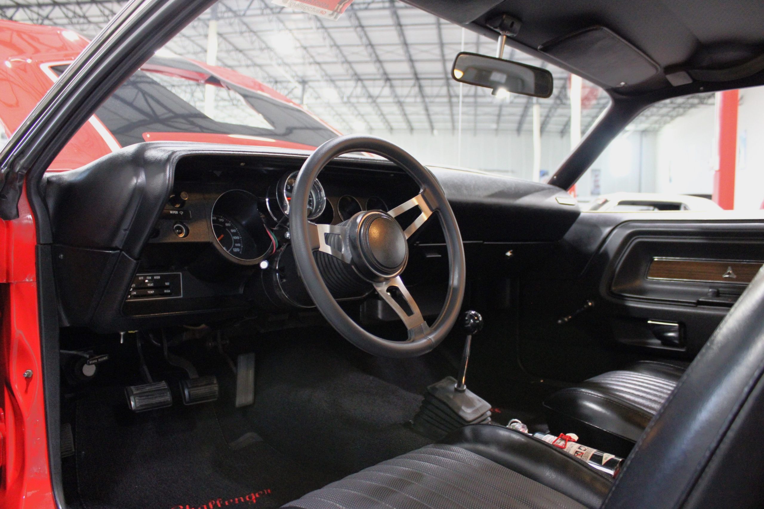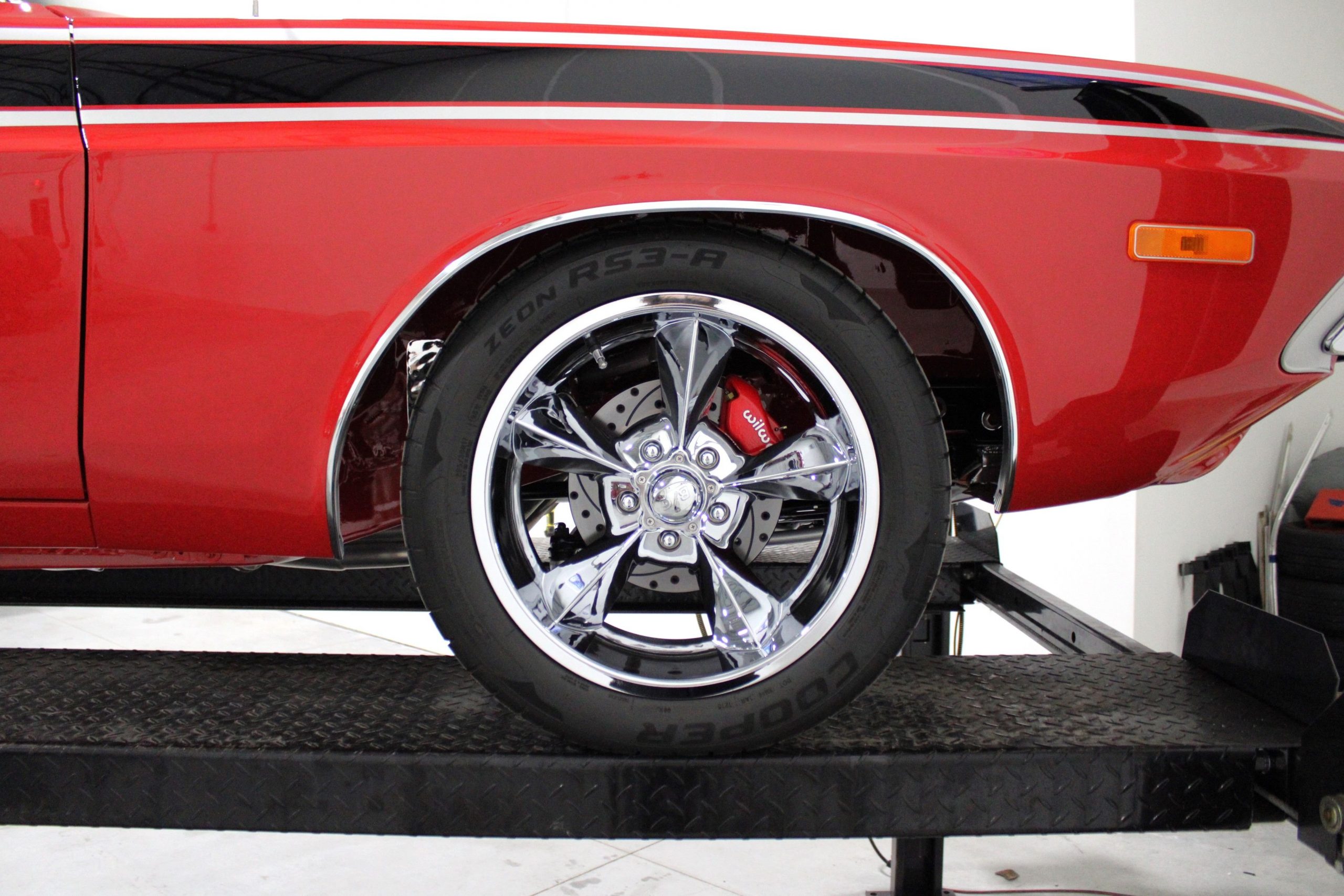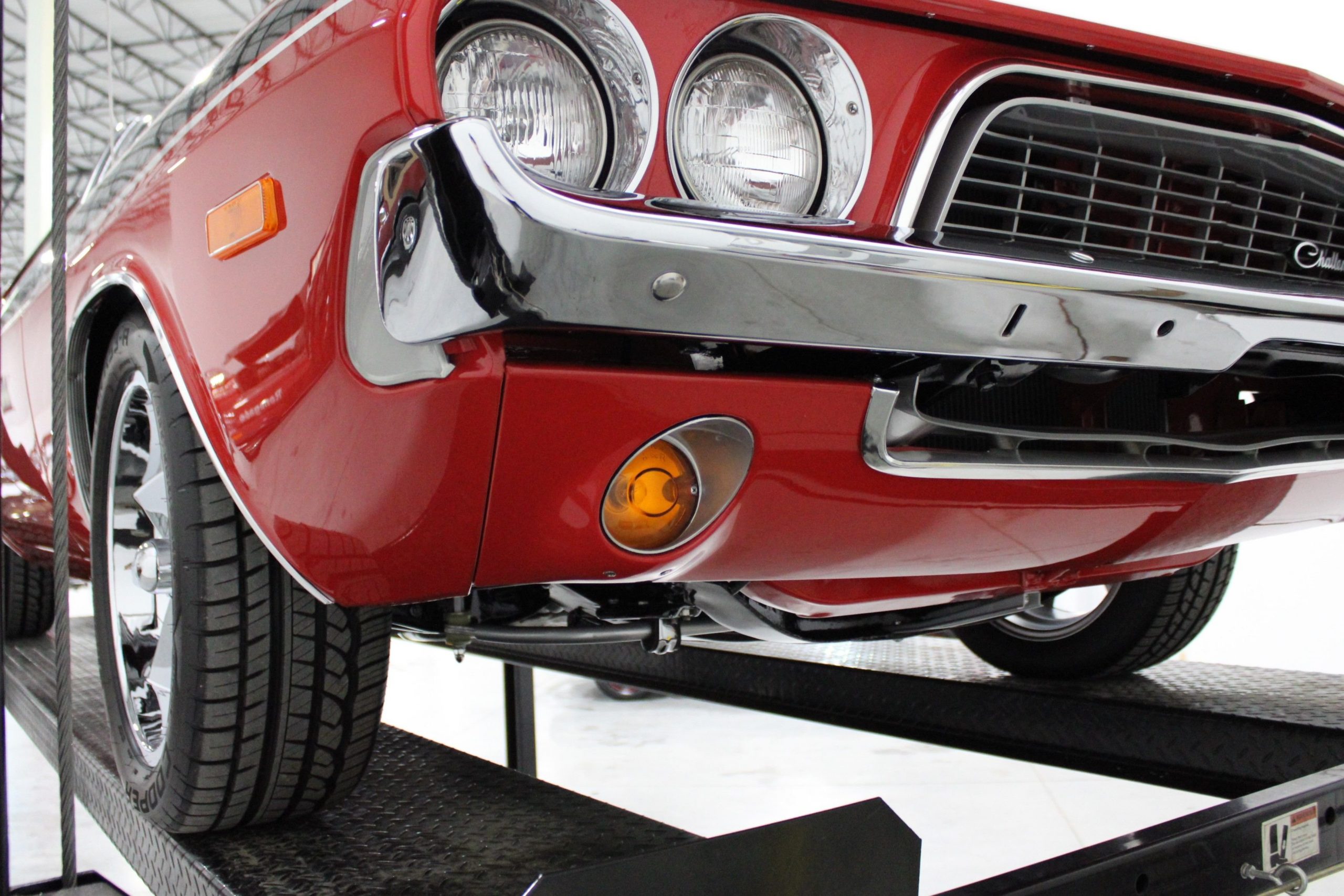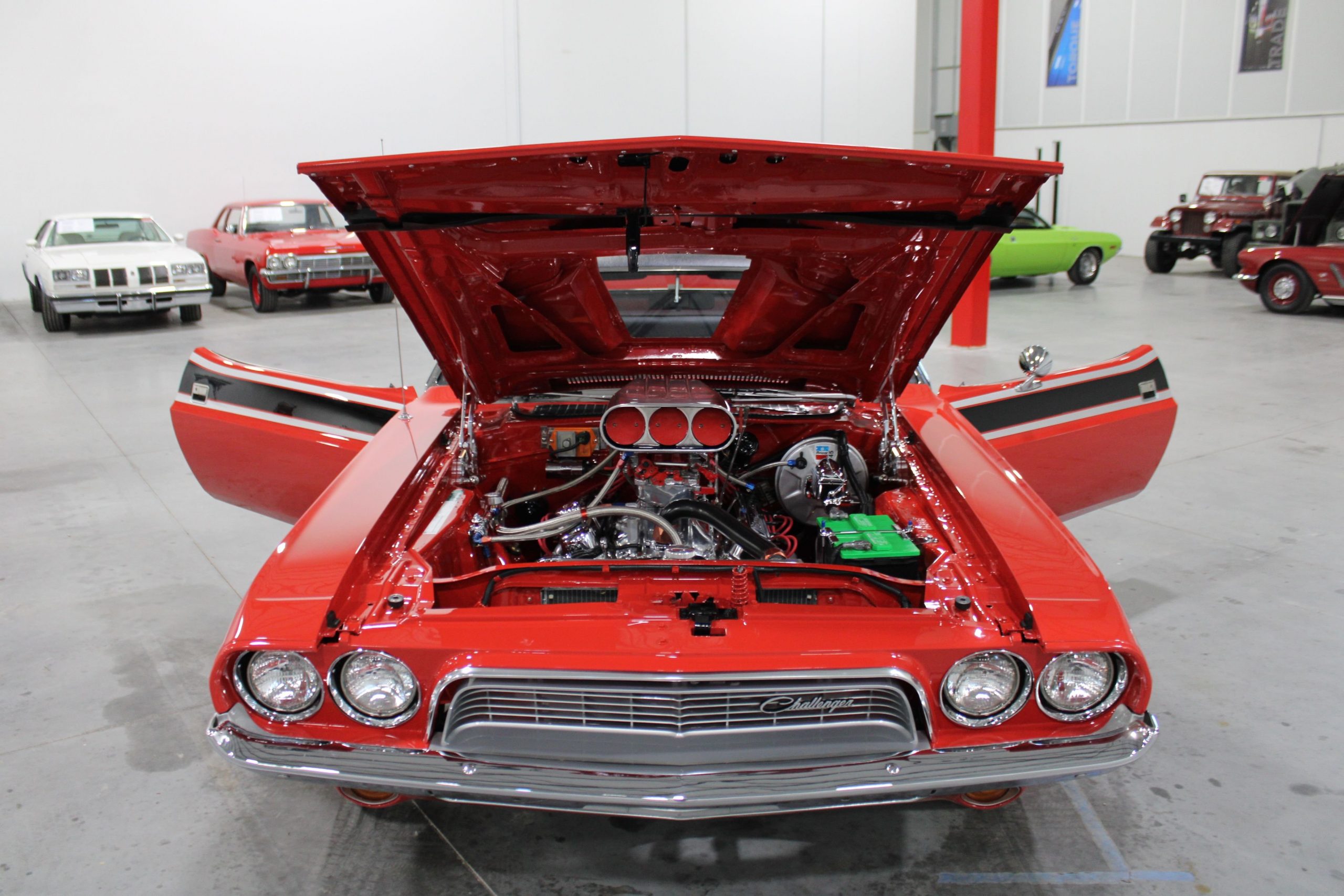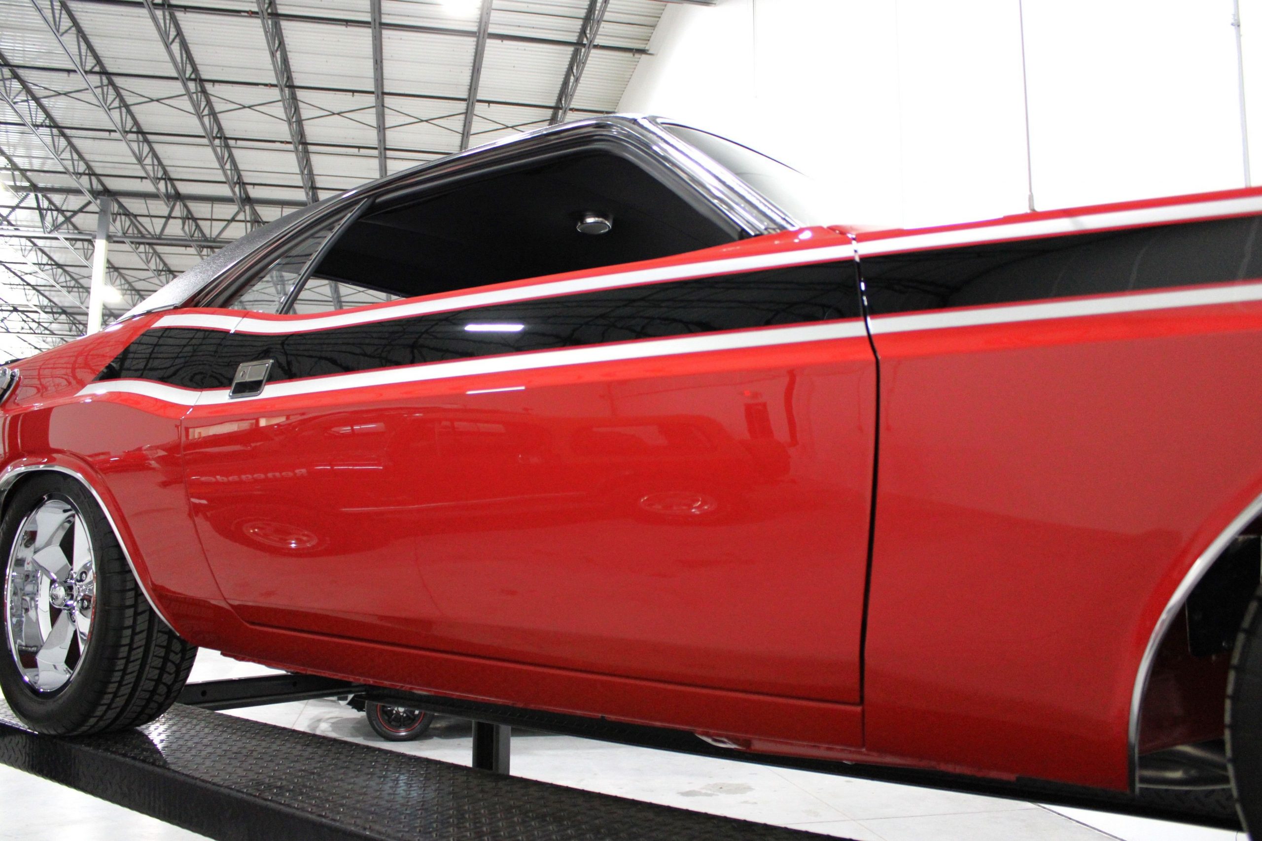 24/7 Motorsof is pleased to offer this beautiful 1973 Dodge Challenger for your consideration. This stunning muscle car is a oner owner car. The paint scheme is a design of his own. He chose the factory Bright Red for the base color. On top of that, silver and black stripes were laid out. On top of it all is a brand new black vinyl top. The paint was shot in 2008 and still looks flawless. The interior is a clean and crisp factory black. A fire extinguisher, Autometer tach and an aftermarket radio were added. But under the hood is where the real magic happens. The original 340 was a High Performance 4 Barrel engine but that wasn’t enough. he added a ton of chrome and polished aluminum, along trick parts to make a serious street machine. A polished Edelbrock tunnel ram supports 2 Holley 450’s carbs with chrome bowls, and progressive linkage, a polished Street Scope pokes out of the hood to breathe in all the fresh air. Moving to the cylinder heads, these to are Polished Edelbrock Performer RPM’s to be exact. Chrome Direct Connection valve covers seal everything up. A Comp Cams Thumper hydraulic roller hides inside the 340. A Milidon Gear Drive keeps everything in time. The rest of the engine bay is covered with chrome goodies. The Suspension has plenty of upgrades as well, such as; Wilwood 4 piston disc brakes, chrome master cylinder, new Hotchkis torsion bars, Hotchkis rear springs, chrome driveshaft, chrome hood hinges, and many more items as you can see in the pictures. This has been a great car for the original owner, now it’s time for a new owner. Drive this one out of our showroom or have us assist with shipping it to you anywhere in the United States! Don’t hesitate to give us a call with any questions or for more information.