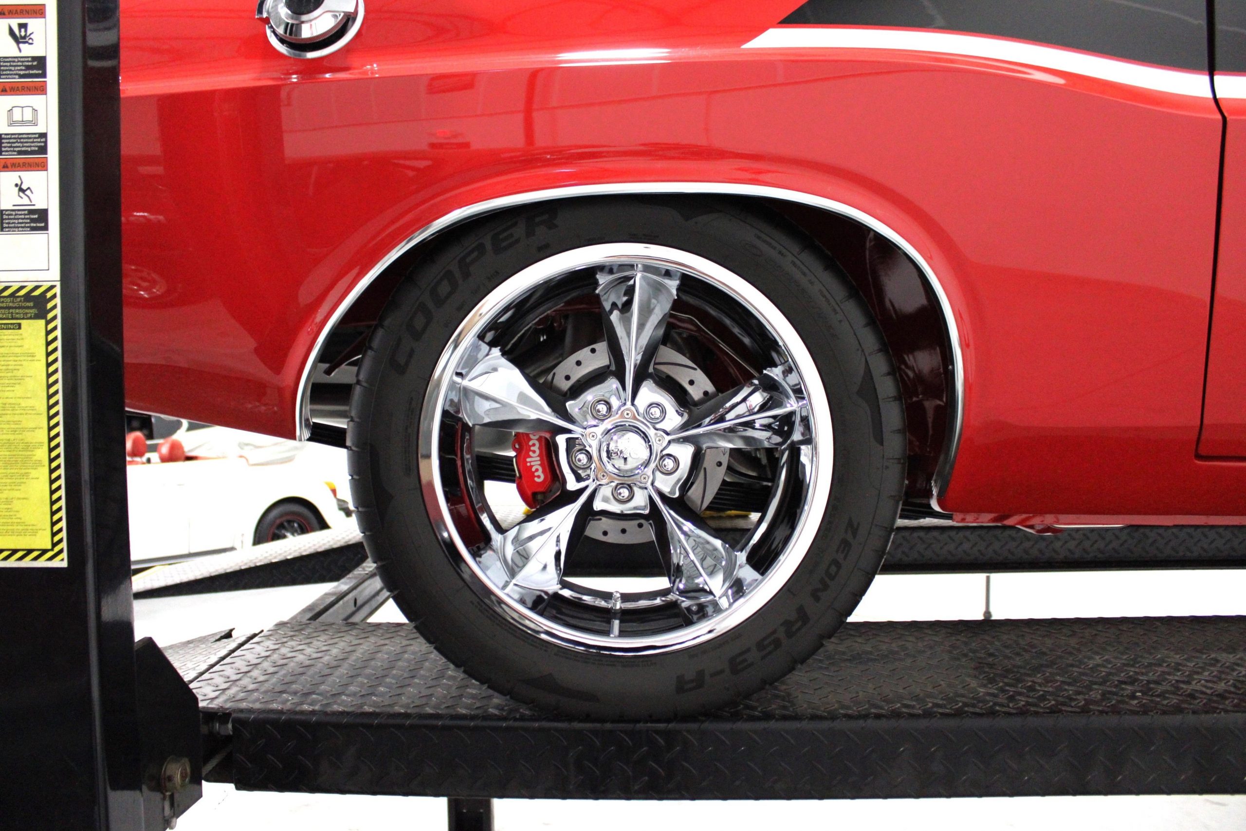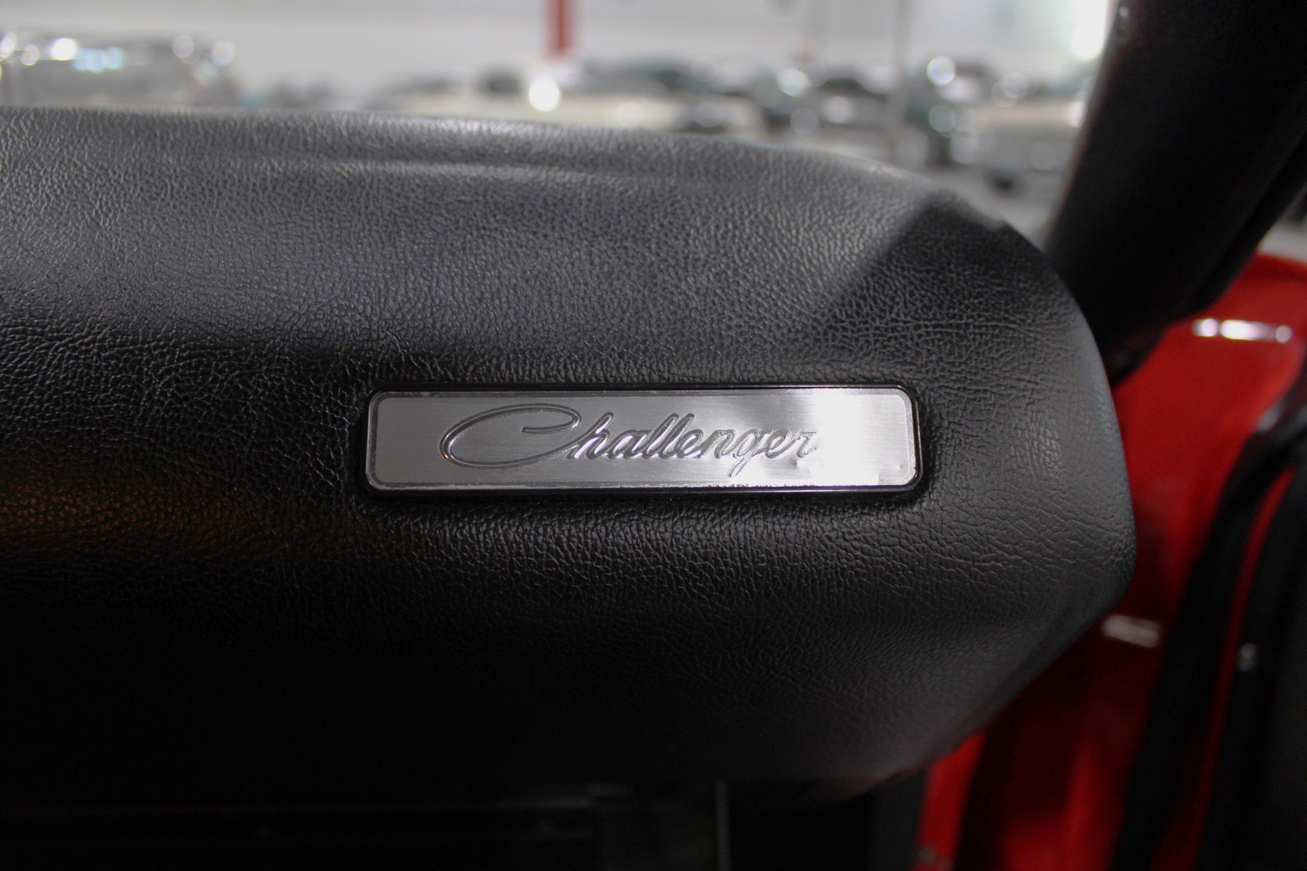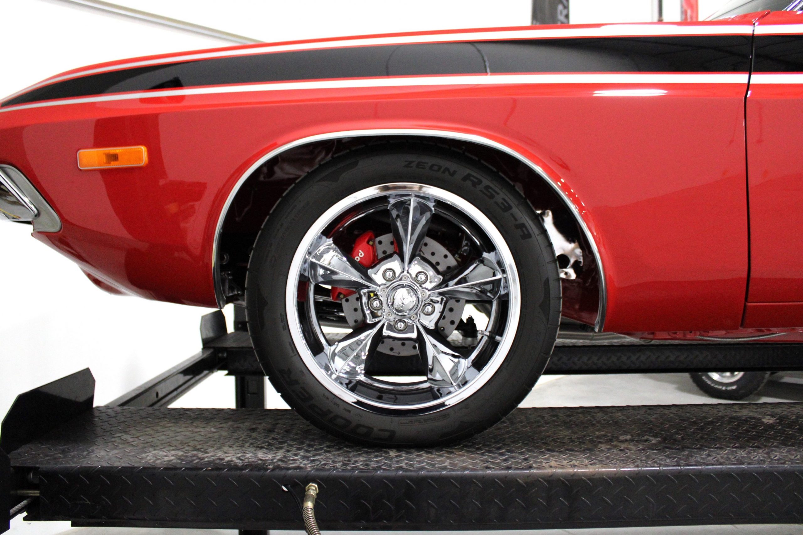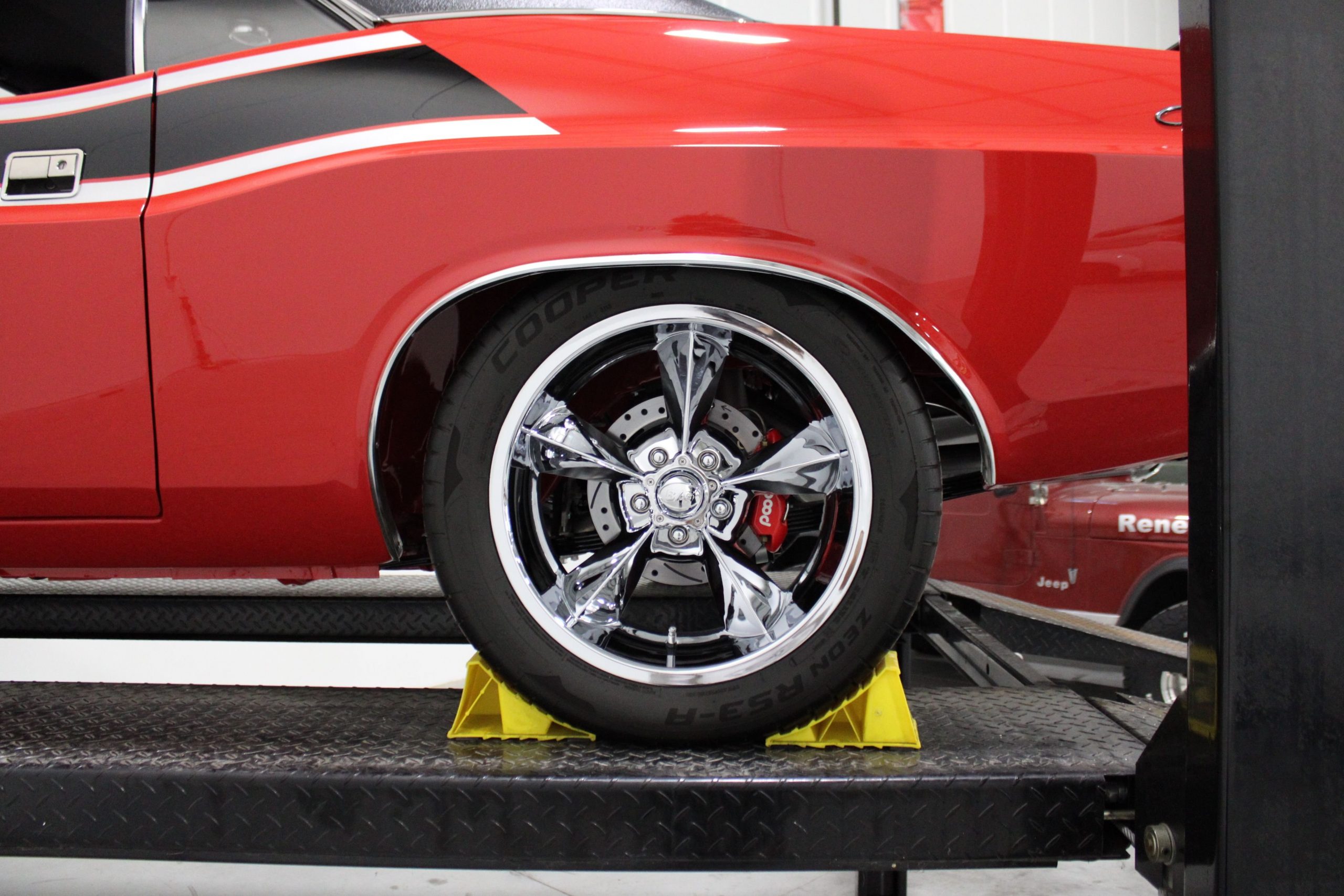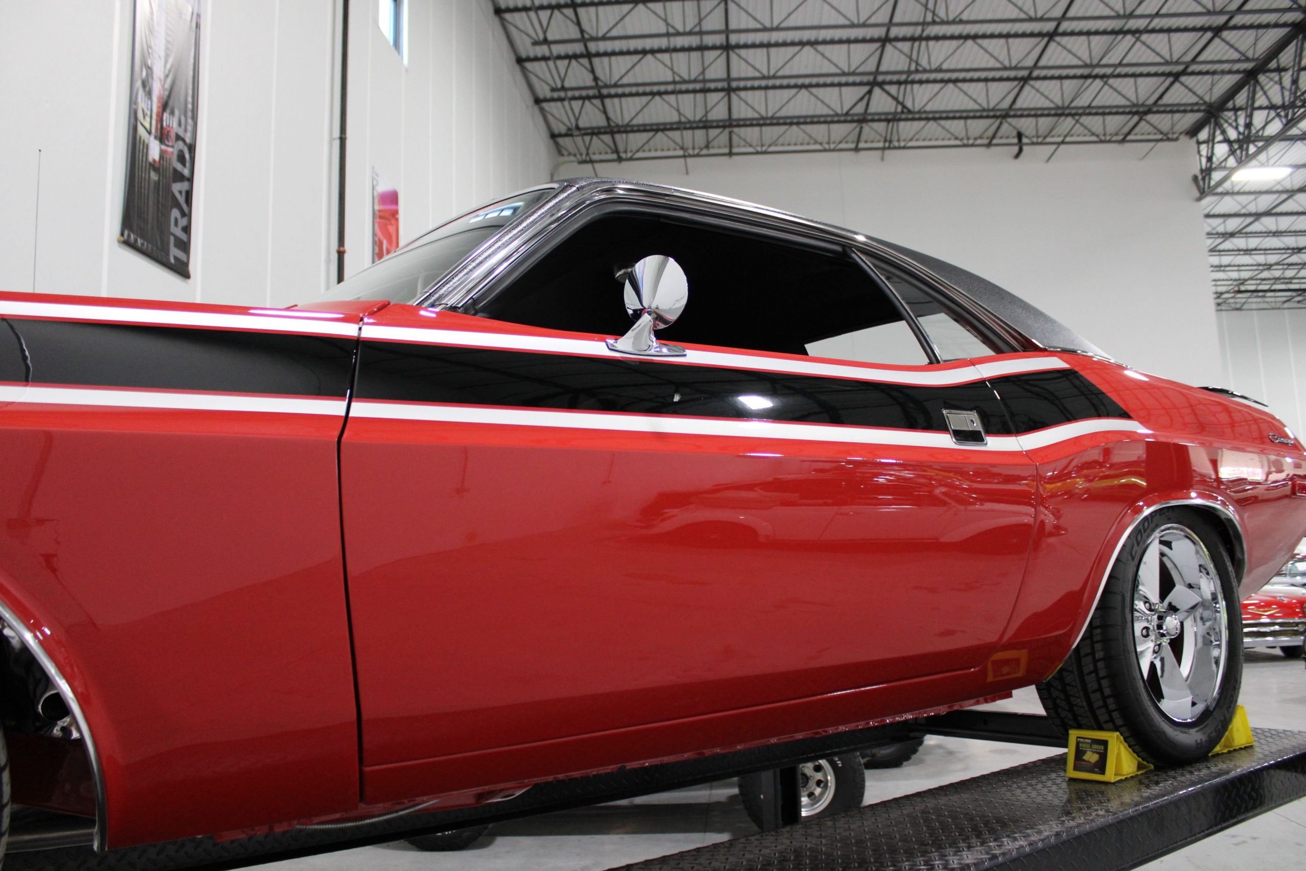 24/7 Motorsof is pleased to offer this beautiful 1973 Dodge Challenger for your consideration. This stunning muscle car is a oner owner car. The paint scheme is a design of his own. He chose the factory Bright Red for the base color. On top of that, silver and black stripes were laid out. On top of it all is a brand new black vinyl top. The paint was shot in 2008 and still looks flawless. The interior is a clean and crisp factory black. A fire extinguisher, Autometer tach and an aftermarket radio were added. But under the hood is where the real magic happens. The original 340 was a High Performance 4 Barrel engine but that wasn’t enough. he added a ton of chrome and polished aluminum, along trick parts to make a serious street machine. A polished Edelbrock tunnel ram supports 2 Holley 450’s carbs with chrome bowls, and progressive linkage, a polished Street Scope pokes out of the hood to breathe in all the fresh air. Moving to the cylinder heads, these to are Polished Edelbrock Performer RPM’s to be exact. Chrome Direct Connection valve covers seal everything up. A Comp Cams Thumper hydraulic roller hides inside the 340. A Milidon Gear Drive keeps everything in time. The rest of the engine bay is covered with chrome goodies. The Suspension has plenty of upgrades as well, such as; Wilwood 4 piston disc brakes, chrome master cylinder, new Hotchkis torsion bars, Hotchkis rear springs, chrome driveshaft, chrome hood hinges, and many more items as you can see in the pictures. This has been a great car for the original owner, now it’s time for a new owner. Drive this one out of our showroom or have us assist with shipping it to you anywhere in the United States! Don’t hesitate to give us a call with any questions or for more information.