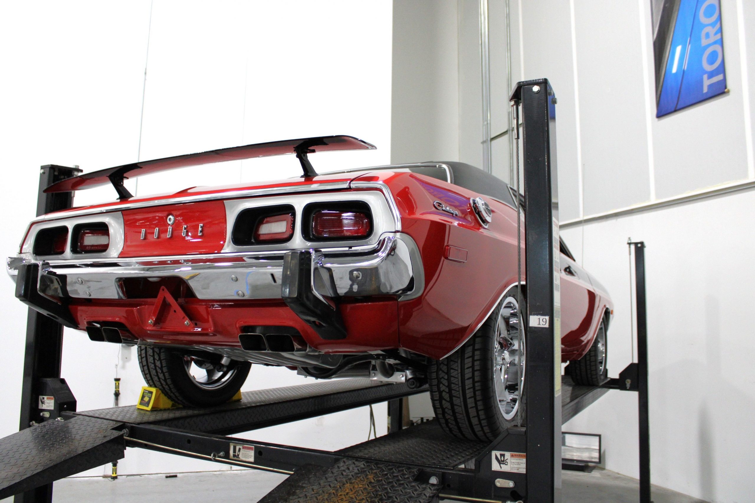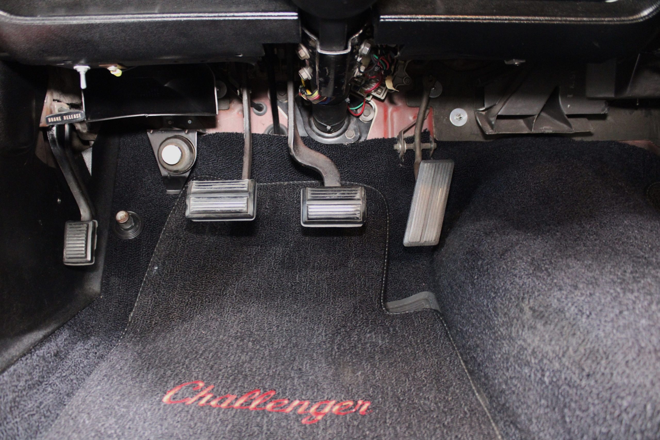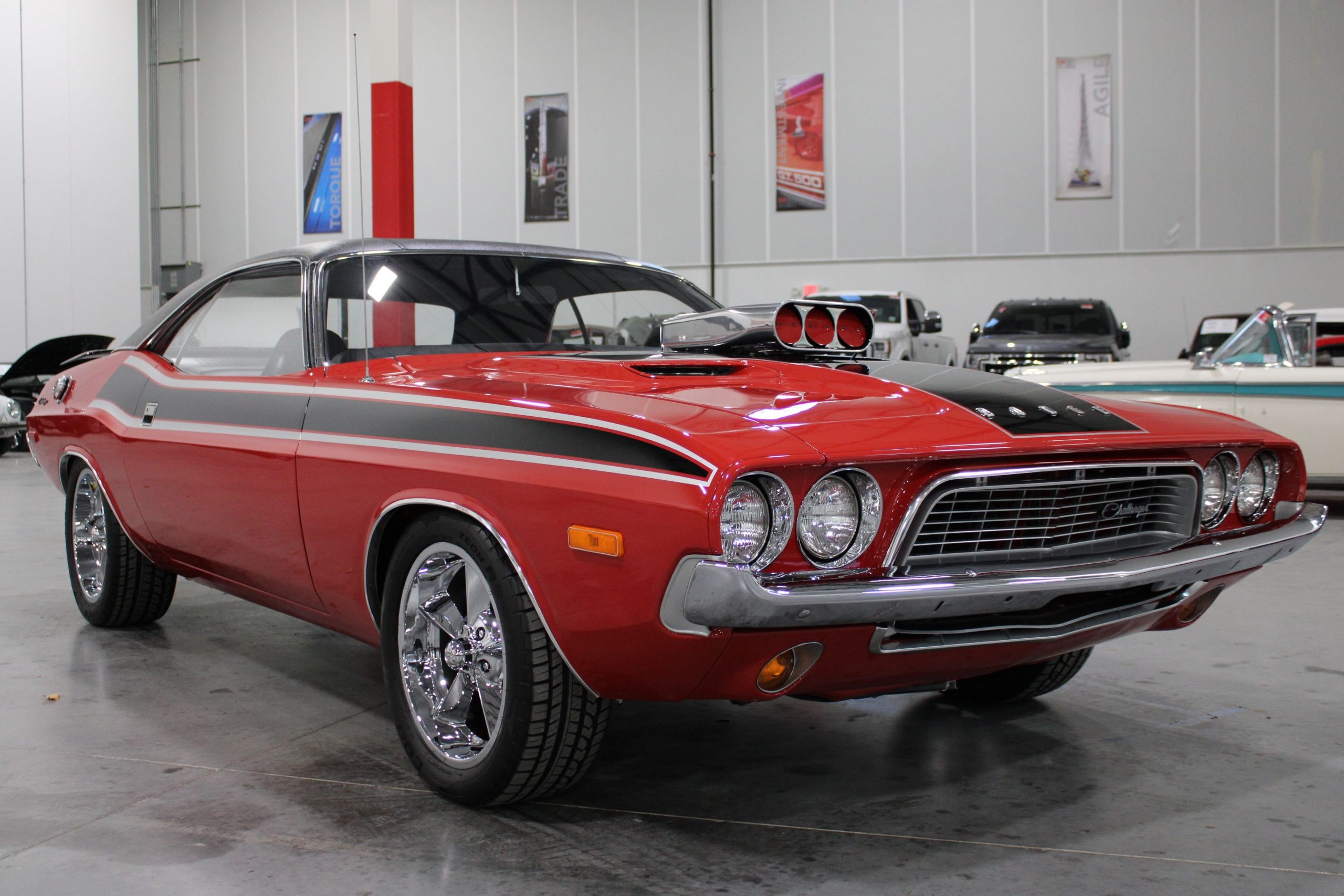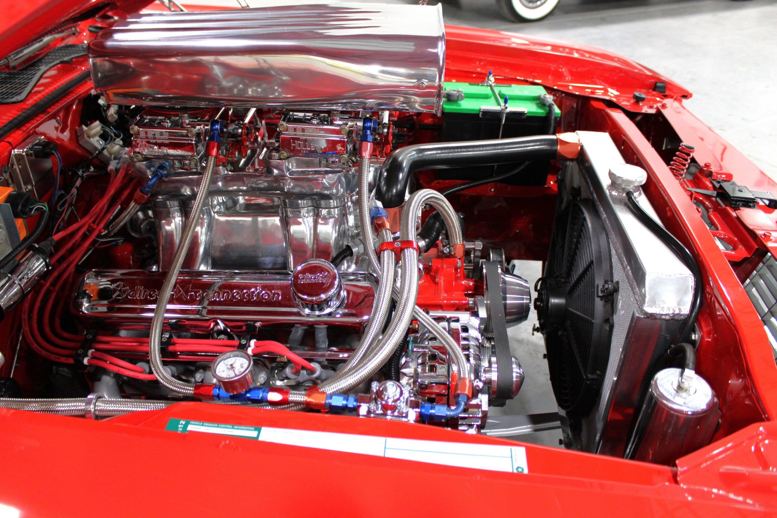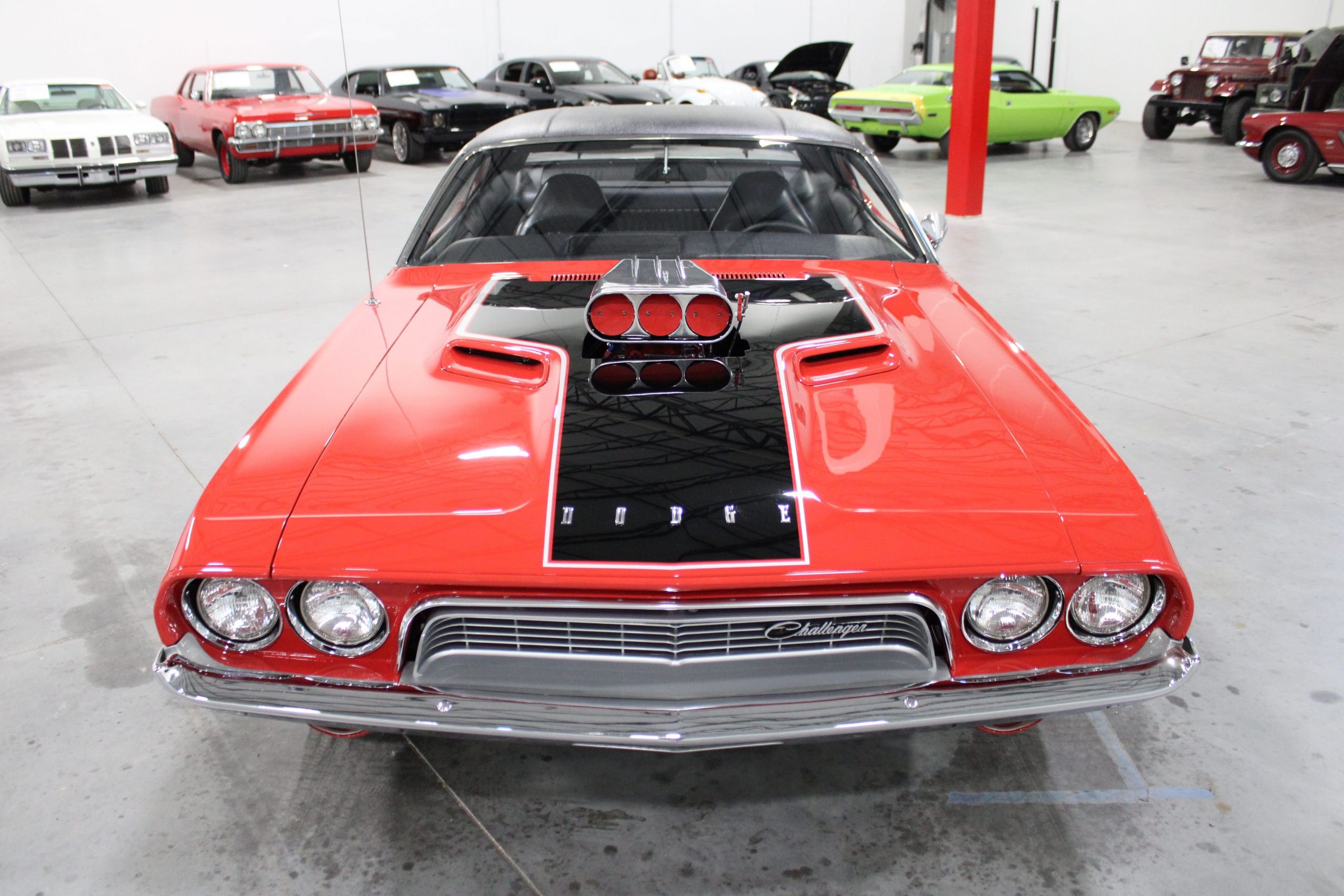 24/7 Motorsof is pleased to offer this beautiful 1973 Dodge Challenger for your consideration. This stunning muscle car is a oner owner car. The paint scheme is a design of his own. He chose the factory Bright Red for the base color. On top of that, silver and black stripes were laid out. On top of it all is a brand new black vinyl top. The paint was shot in 2008 and still looks flawless. The interior is a clean and crisp factory black. A fire extinguisher, Autometer tach and an aftermarket radio were added. But under the hood is where the real magic happens. The original 340 was a High Performance 4 Barrel engine but that wasn’t enough. he added a ton of chrome and polished aluminum, along trick parts to make a serious street machine. A polished Edelbrock tunnel ram supports 2 Holley 450’s carbs with chrome bowls, and progressive linkage, a polished Street Scope pokes out of the hood to breathe in all the fresh air. Moving to the cylinder heads, these to are Polished Edelbrock Performer RPM’s to be exact. Chrome Direct Connection valve covers seal everything up. A Comp Cams Thumper hydraulic roller hides inside the 340. A Milidon Gear Drive keeps everything in time. The rest of the engine bay is covered with chrome goodies. The Suspension has plenty of upgrades as well, such as; Wilwood 4 piston disc brakes, chrome master cylinder, new Hotchkis torsion bars, Hotchkis rear springs, chrome driveshaft, chrome hood hinges, and many more items as you can see in the pictures. This has been a great car for the original owner, now it’s time for a new owner. Drive this one out of our showroom or have us assist with shipping it to you anywhere in the United States! Don’t hesitate to give us a call with any questions or for more information.