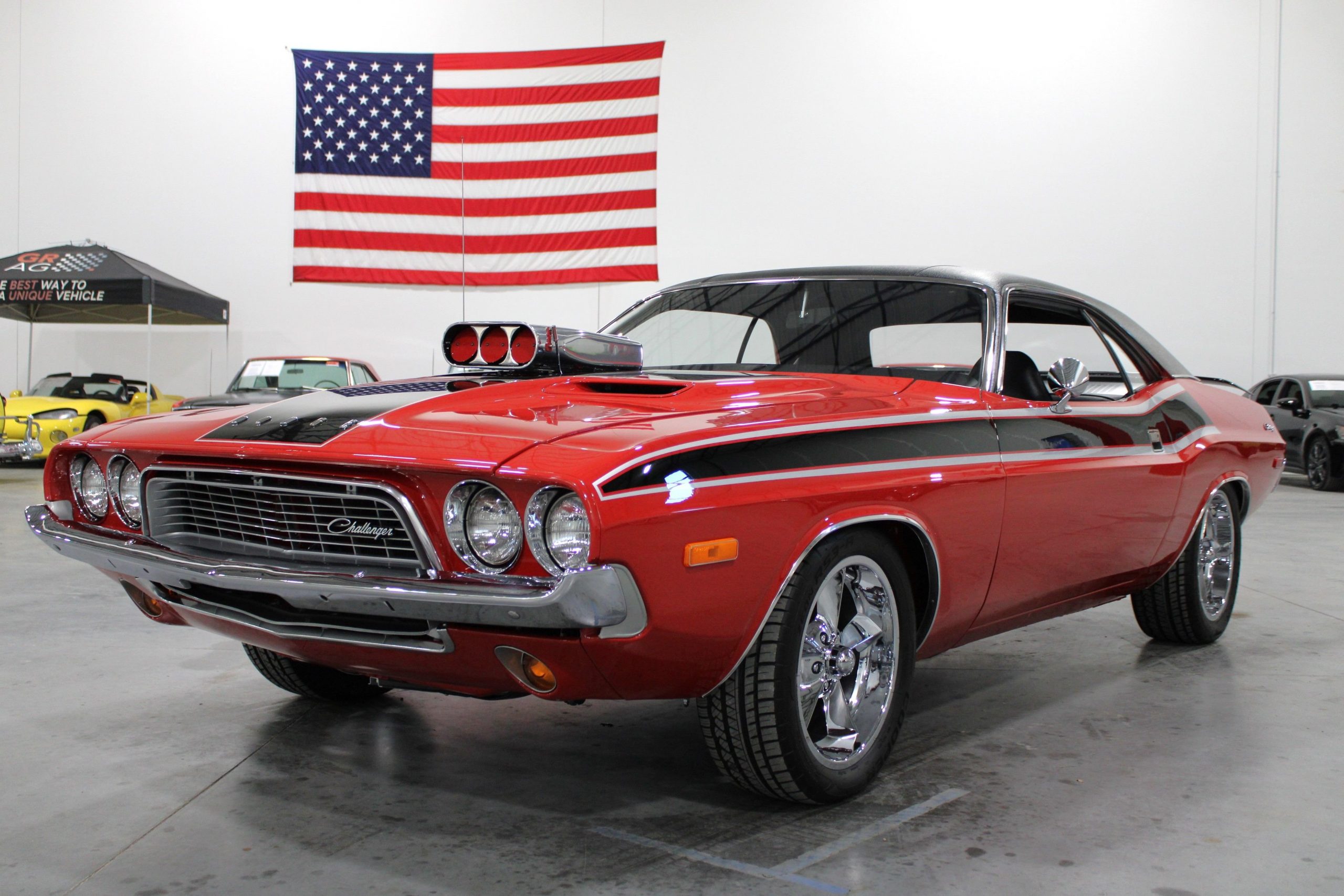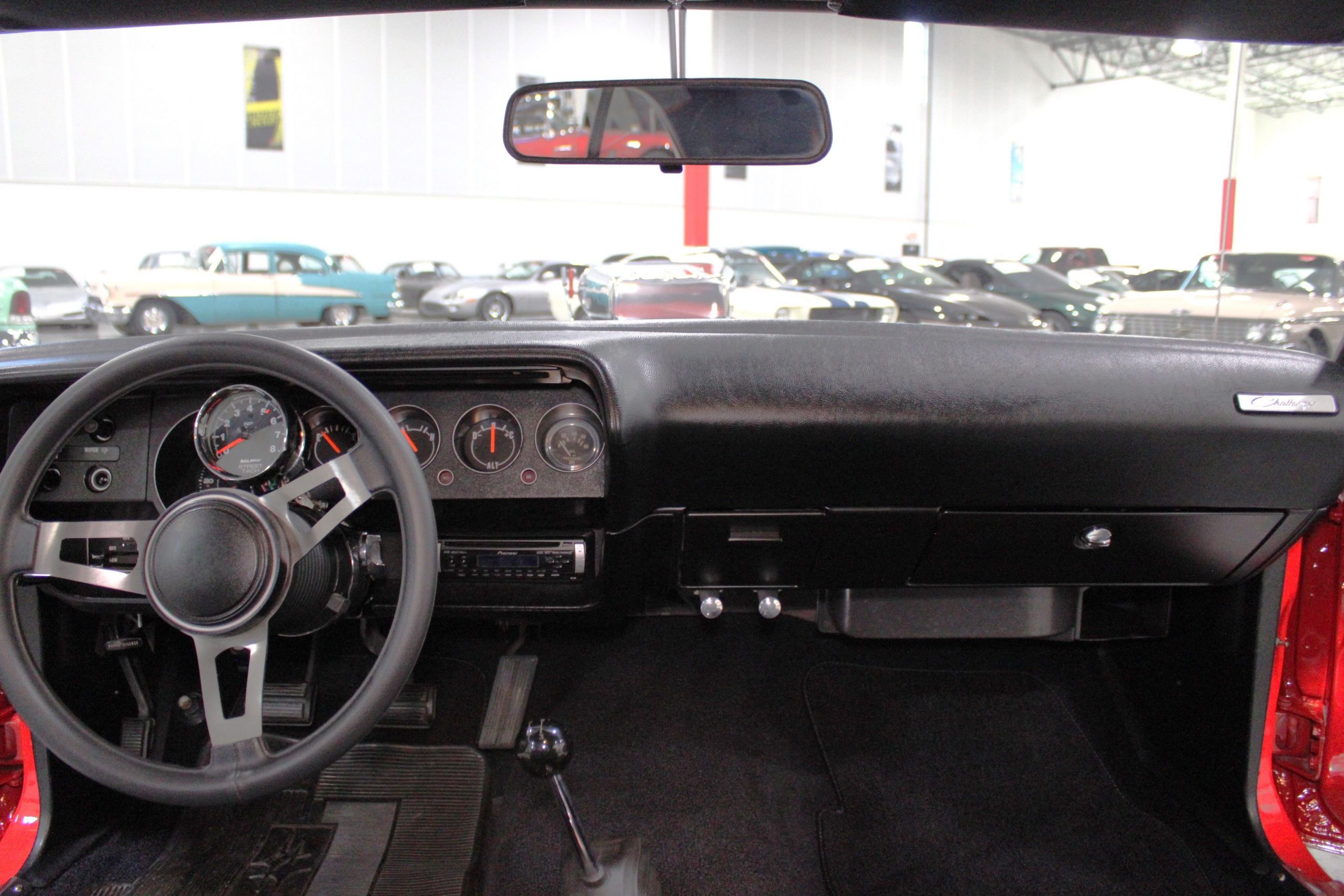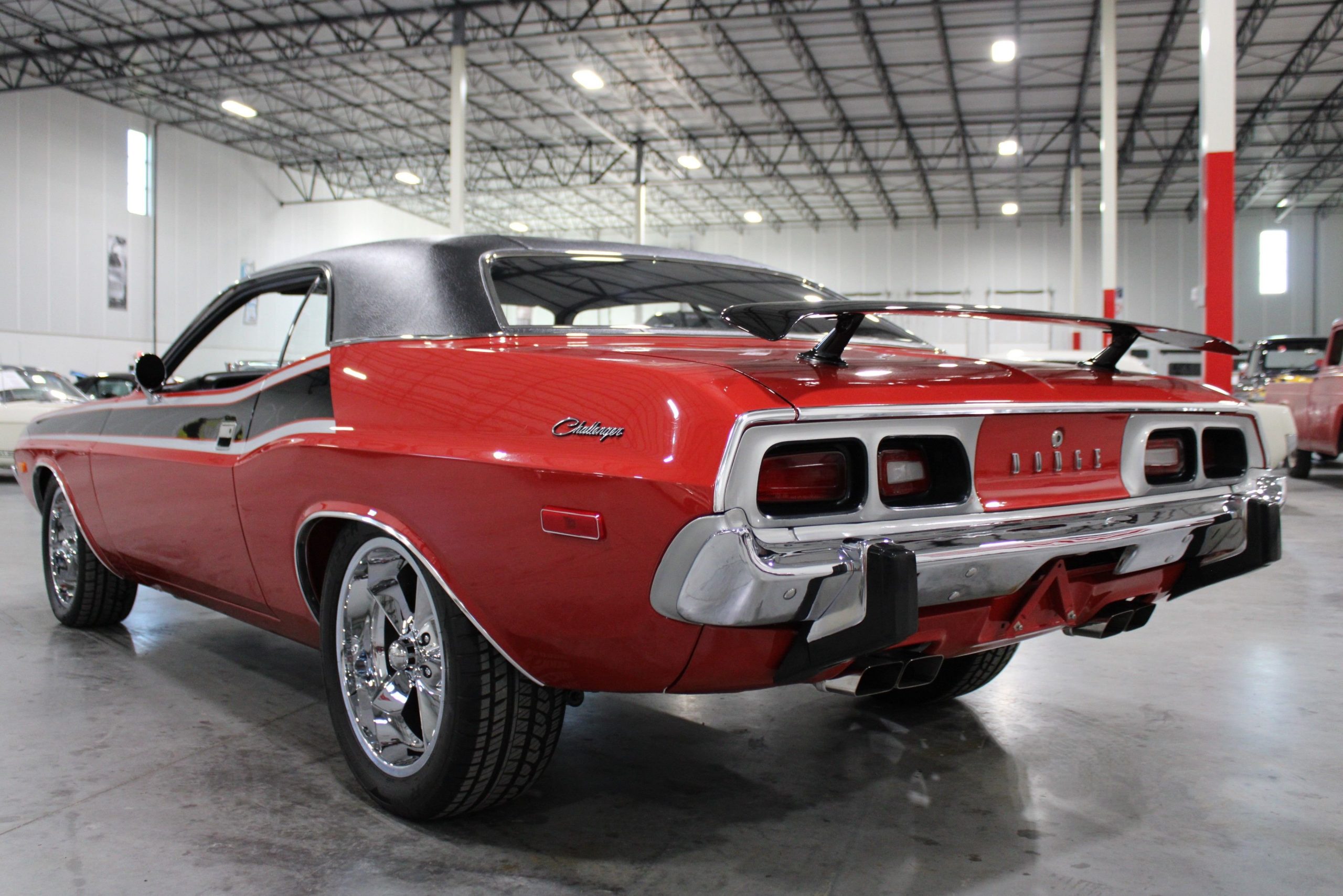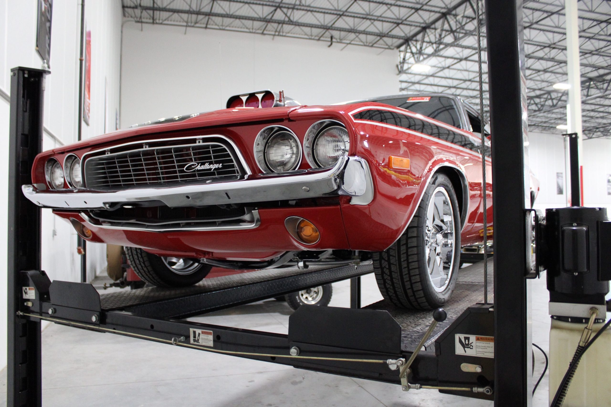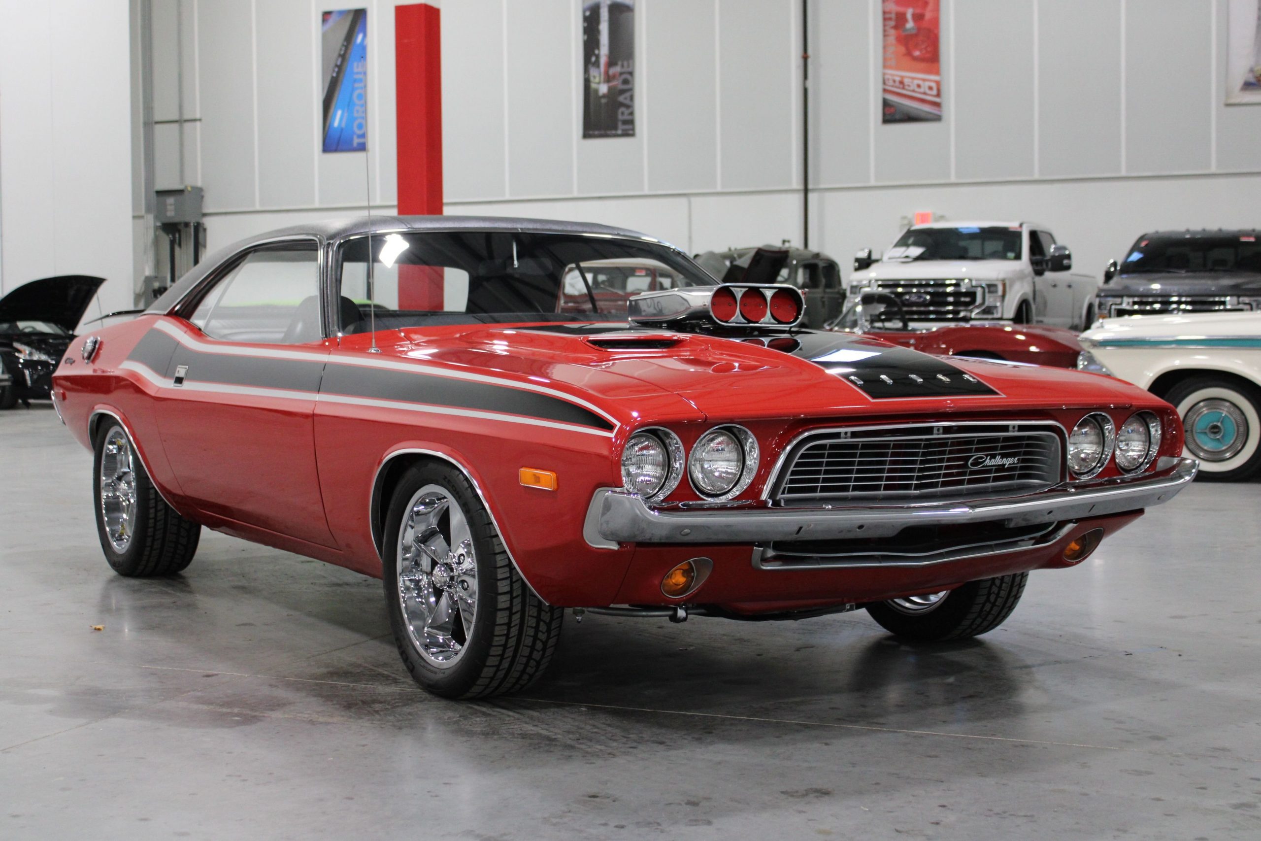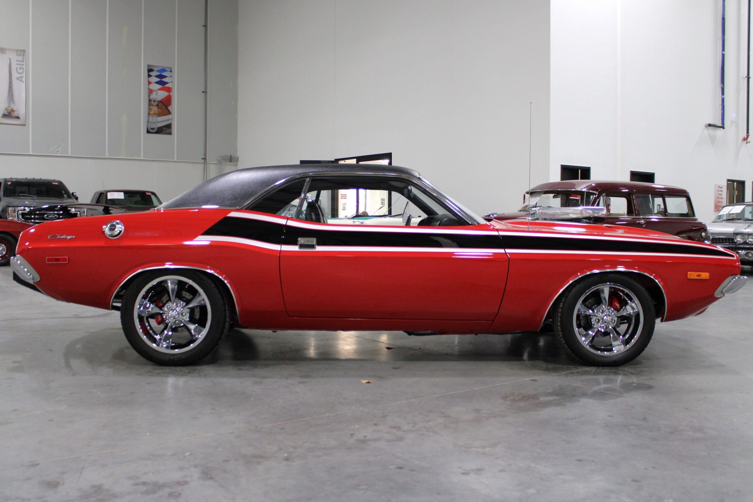 24/7 Motorsof is pleased to offer this beautiful 1973 Dodge Challenger for your consideration. This stunning muscle car is a oner owner car. The paint scheme is a design of his own. He chose the factory Bright Red for the base color. On top of that, silver and black stripes were laid out. On top of it all is a brand new black vinyl top. The paint was shot in 2008 and still looks flawless. The interior is a clean and crisp factory black. A fire extinguisher, Autometer tach and an aftermarket radio were added. But under the hood is where the real magic happens. The original 340 was a High Performance 4 Barrel engine but that wasn’t enough. he added a ton of chrome and polished aluminum, along trick parts to make a serious street machine. A polished Edelbrock tunnel ram supports 2 Holley 450’s carbs with chrome bowls, and progressive linkage, a polished Street Scope pokes out of the hood to breathe in all the fresh air. Moving to the cylinder heads, these to are Polished Edelbrock Performer RPM’s to be exact. Chrome Direct Connection valve covers seal everything up. A Comp Cams Thumper hydraulic roller hides inside the 340. A Milidon Gear Drive keeps everything in time. The rest of the engine bay is covered with chrome goodies. The Suspension has plenty of upgrades as well, such as; Wilwood 4 piston disc brakes, chrome master cylinder, new Hotchkis torsion bars, Hotchkis rear springs, chrome driveshaft, chrome hood hinges, and many more items as you can see in the pictures. This has been a great car for the original owner, now it’s time for a new owner. Drive this one out of our showroom or have us assist with shipping it to you anywhere in the United States! Don’t hesitate to give us a call with any questions or for more information.